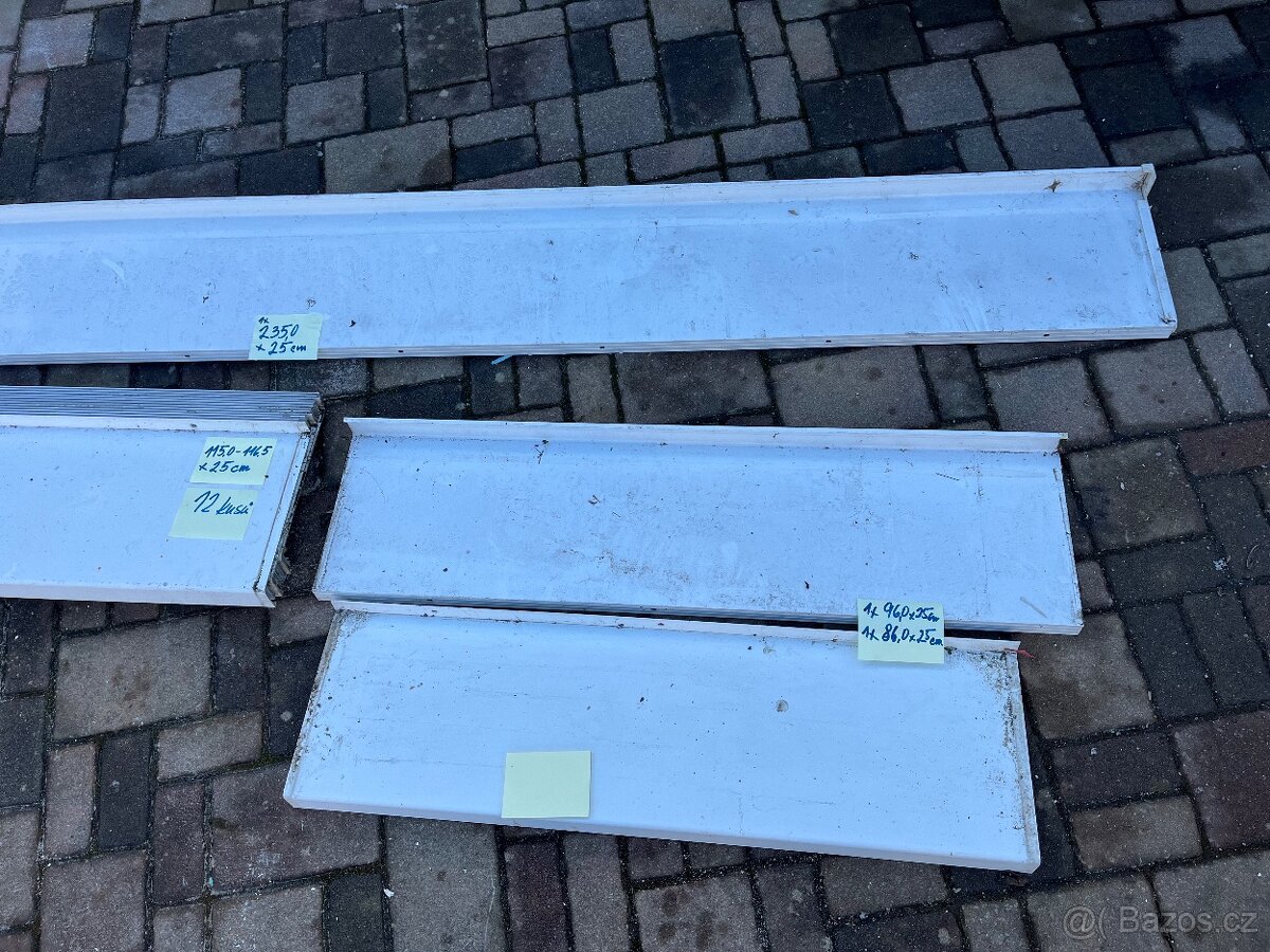 Prodám bíle hliníkové parapety. Rozměr cca. 1150x250mm 100Kč/ kus a jeden parapet 2350x250mm 200Kč. Parapety jsou zaprášené po zimě, ale nejsou poškrábané.