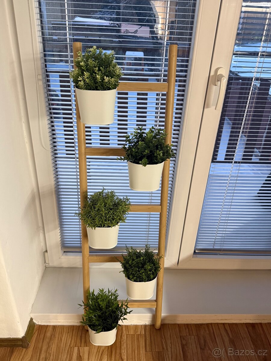 Prodám držák na květináče, 5 květináčů a 5 umělých rostlin. Jako nové.