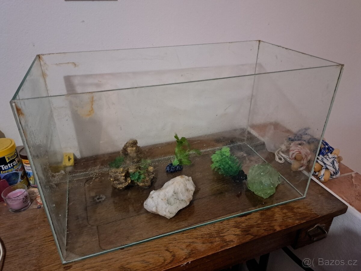 Nabizim akvárium rozměrů 60x 36x30cm= něco přes 60l, přidám i kamen, nějaké rostliny, prip i bílý písek.