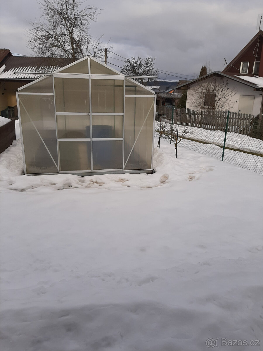 Prodám hliníkový skleník z polykarbonátu.Š 253cm,D 377cm, V 223cm. + ocelová základna a 2xautomatický otvírač oken Nutná výměna desek na střeše. Původní cena 18000,-Kč. Prodám za 4800,-Kč.
