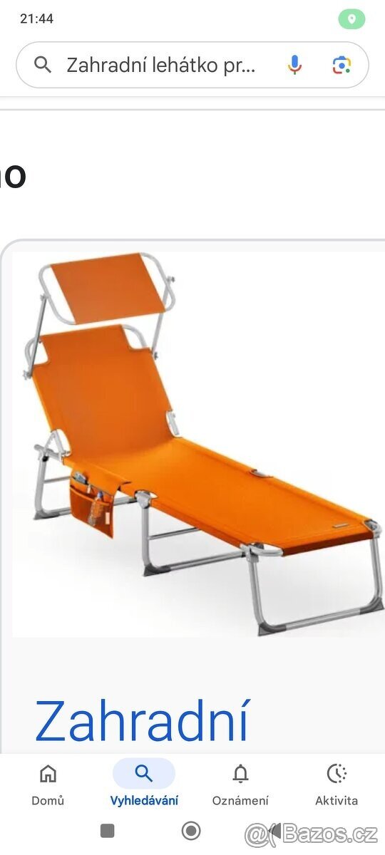 Prodám 2 nová lehátka v oranžové barvě se stříškou, nepoužívané, cena za jedno 810 Kč, za obě 1500,- Kc