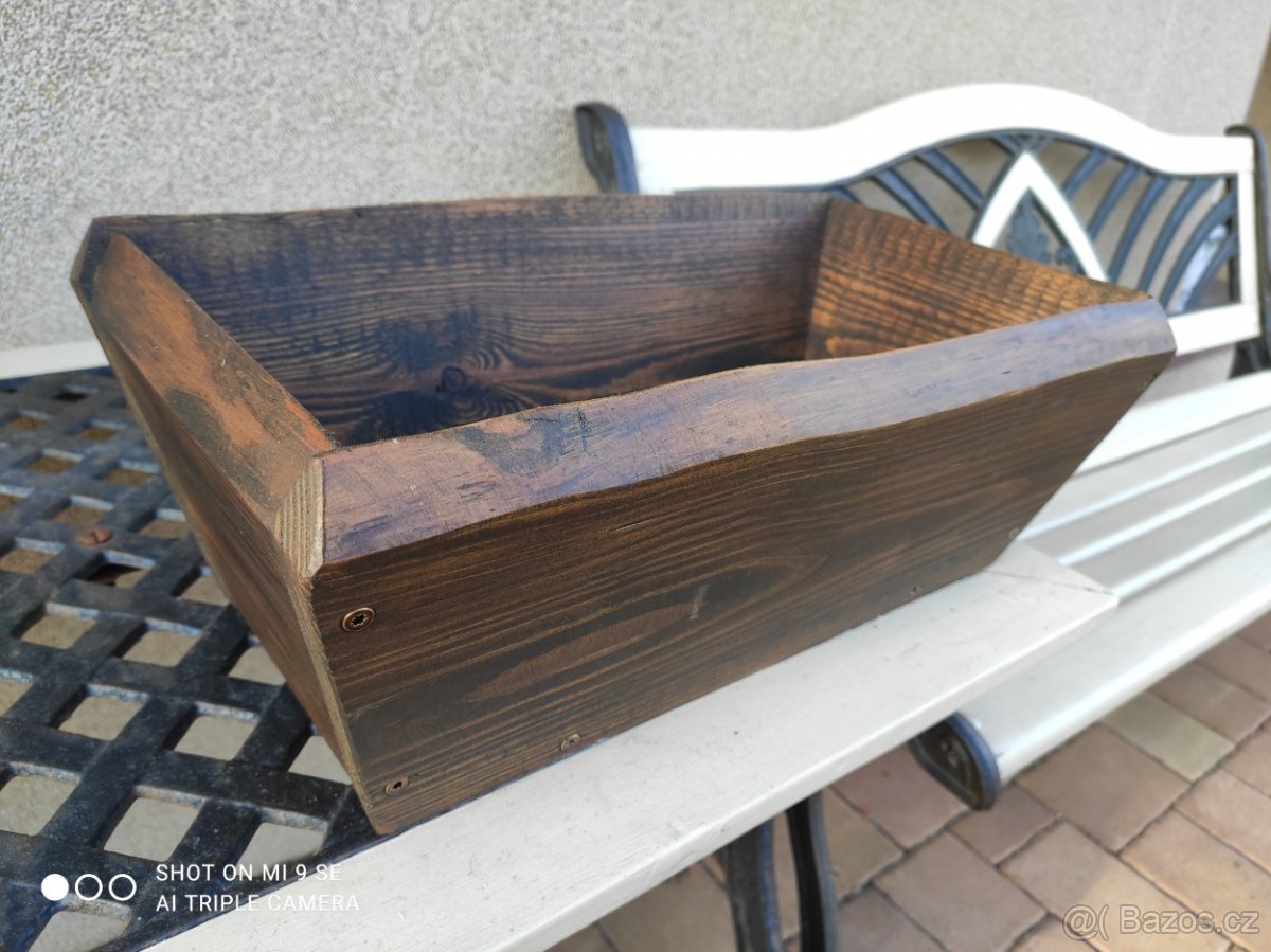 Prodám masivní borový truhlík o velikosti cca 45*25*16 cm. Bez nátěru cena 250,- natřený venkovní olejovou lazurou ořech/dub. Palisandr 300,-. Ručně malovaný s patinou 400,- za kus. Na prodej více kusů.