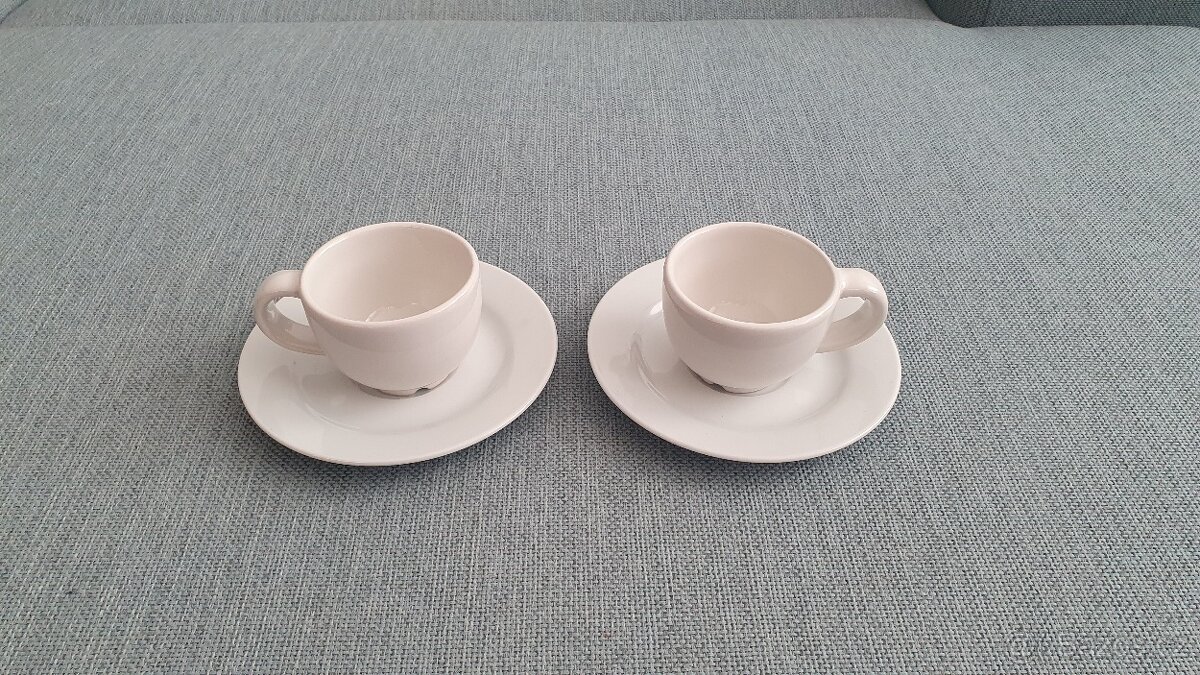 Nové, nepoužité. Výška hrníčku cca 5cm, průměr talířku cca 12cm. Barva talířku bílá, barva hrníčku lehce písková. Prodám pouze oba šálky najednou, cena je uvedena za oba šálky.