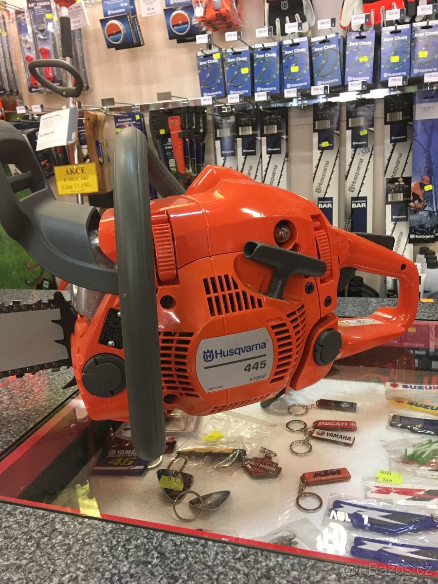 Husqvarna 445 je benzínová řetězová pila, která zvládne bez problémů většinu řezacích prácí na vašem pozemku. Úsporný motor 45cc X-Torq® poskytuje obrovský výkon a zanechává jen minimum emisí. Nízká hmotnost a štíhlé tělo snižují vaši námahu, zatímco palivové čerpadlo, automatický zpětný spínač STOP a výklopná víčka nádrží zajišťují snadné, spolehlivé startování a snadnou manipulaci.