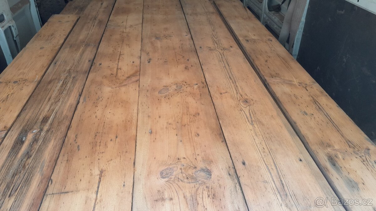 Prodám více jak 150let staré borovicové fošny z podlahy viz. foto. V délkách 2,5 - 3,5m/ tloušťka +- 3,4cm/ šíře 20-30cm. Fošny jsou očištěné, broušené, 100% suché v perfektním bytovém stavu. Cena za m2 = 850kč. Celkem na prodej až 40 m2. Můžeme zajistit dopravu.