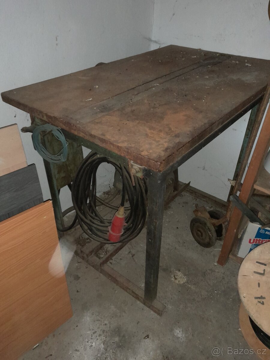 Cirkulárka domácí výroby - [9.2. 2026]Viz fotky, motor nemá štítek nevím příkon, tří fázový. Součástí čtyři kotouče a pravítko do boční U lišty