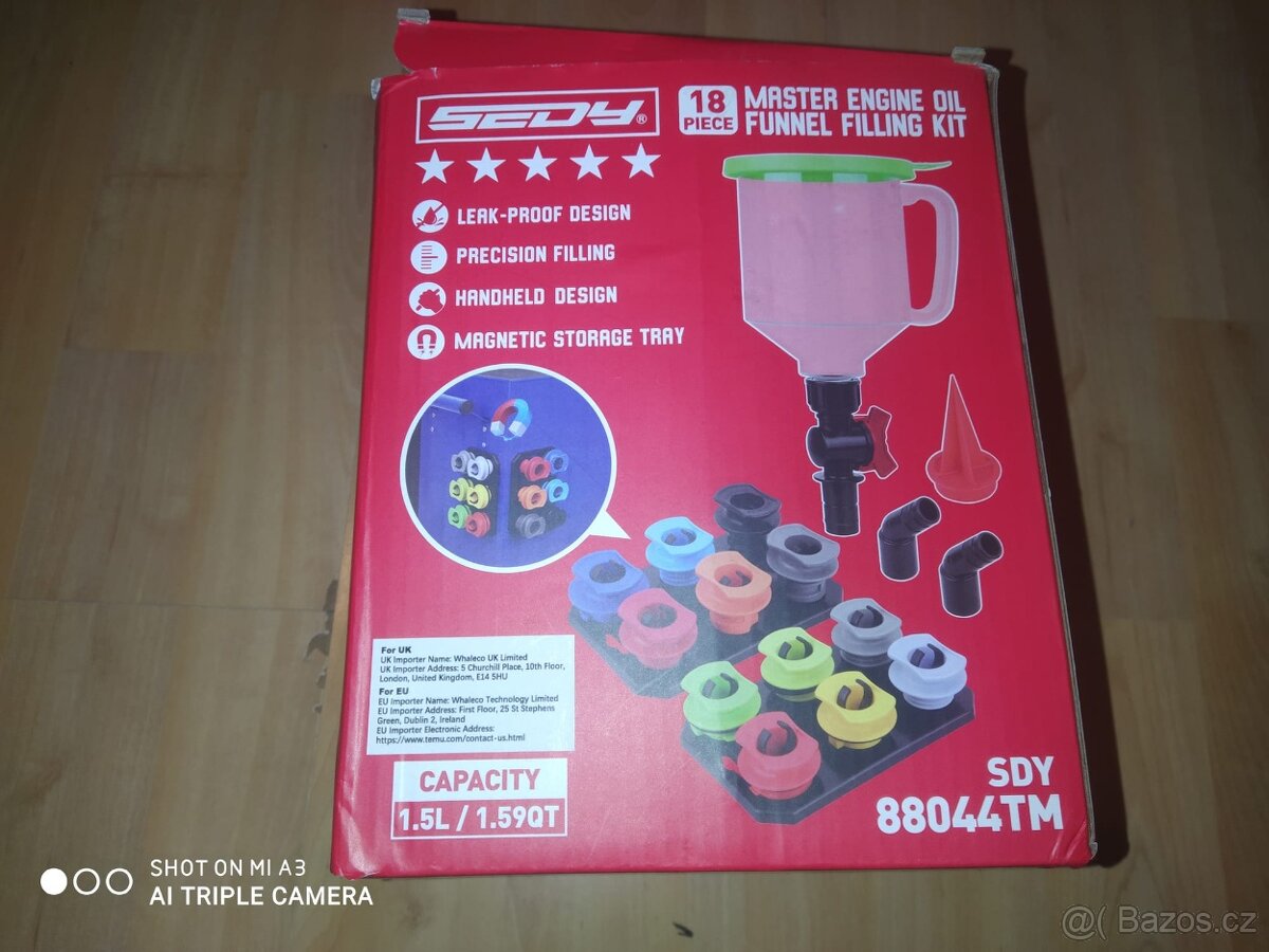 Protože se mi sešly dvě,prodám tuto 17 dílnou sadu na výměnu motorových olejů.Sada obsahuje 12 barevně kódovaných adaptérů vhodných pro různé vozy, včetně:Toyota,Lexus,Scania, Mazda,Ford,Volvo,Audi,Volkswagen Group (VAG),Honda,Nissan,Kia,Hyundai,BMW,Mercedes,General Motors,Chrysler,Subaru a dalších.Obsah:2xmagnetické úložné tácky pro snadnou organizaci,sítko,nalevku,rozbočovače atd.
