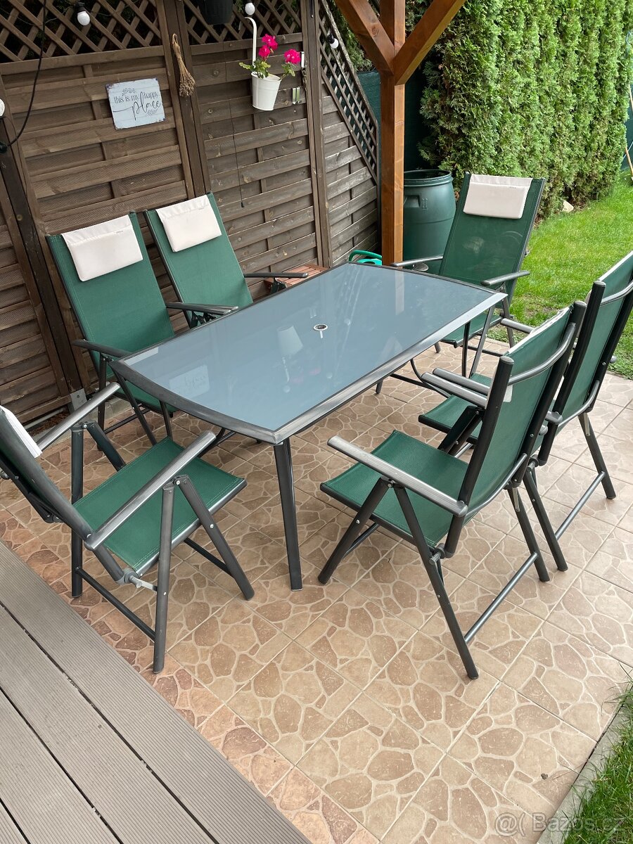 Prodám sestavu záhrobního nábytku, stůl z kovové kostry a tvrzeného skla, židle 6 ks polohovatelné! Původní cena 8000,-, nyní z 2900,-Kč