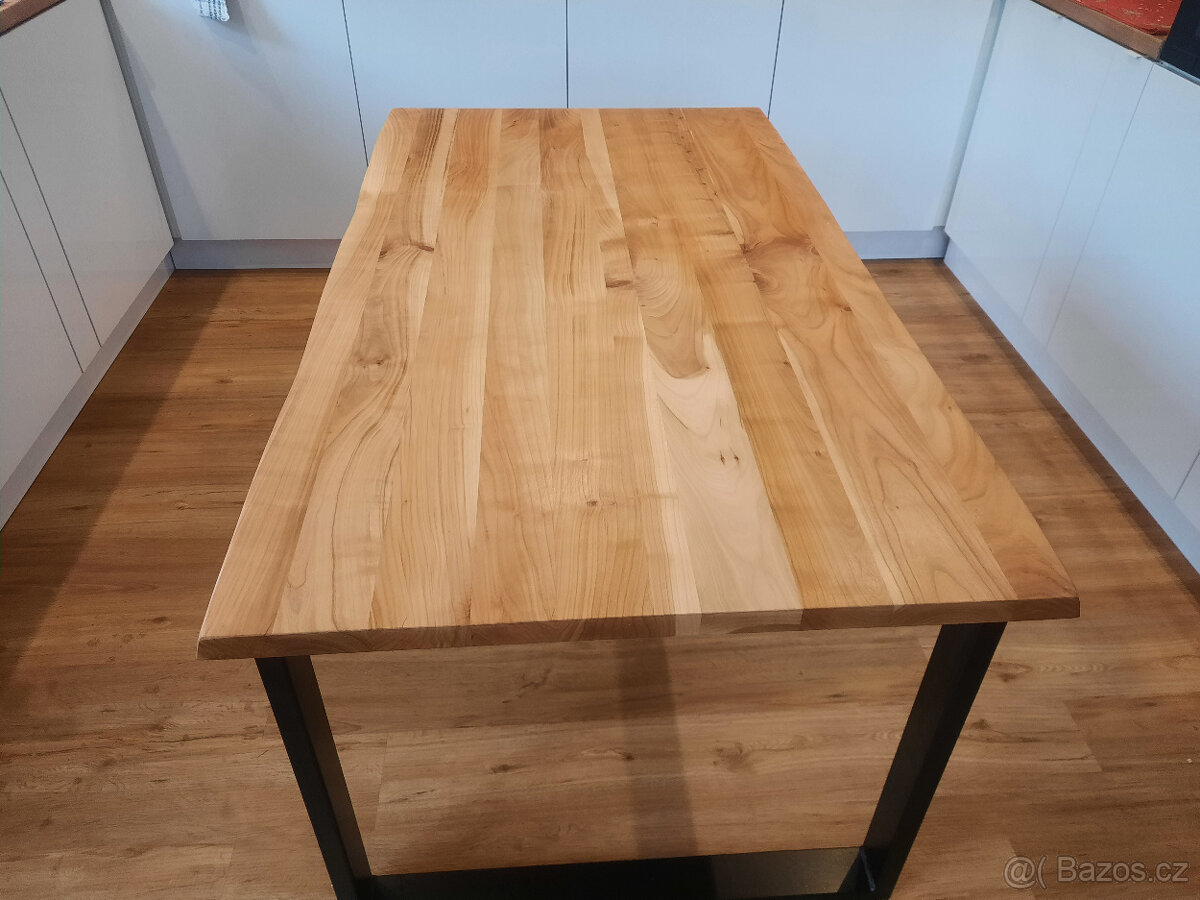 Prodám kuchynský jídelní stůl o rozměrech 1420x800x32 mm.Vrchní deska je podélně lepená z třešnového dřeva.Podnož ocel,barva černá komaxit.Stůl je nový.Židle nejsou v ceně