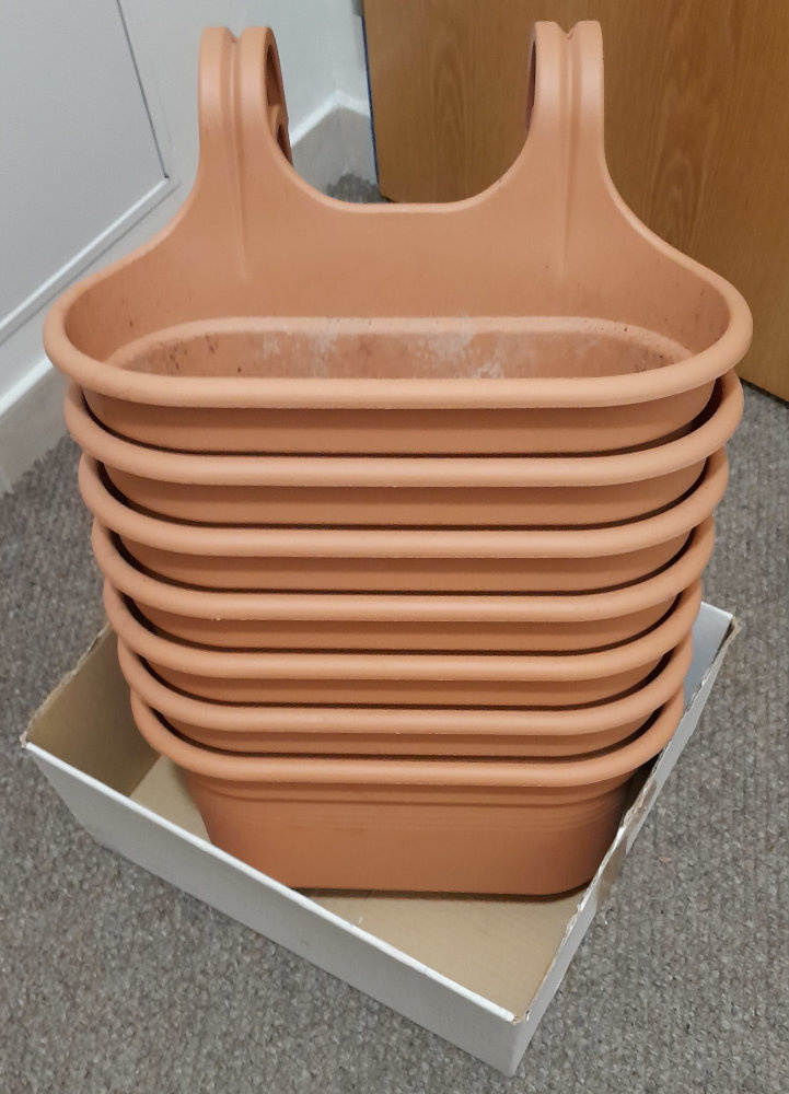 Funkční, nepoškozené závěsné truhlíky - 7 kusů, plastové provedení. Cena 199 Kč za všechny kusy.