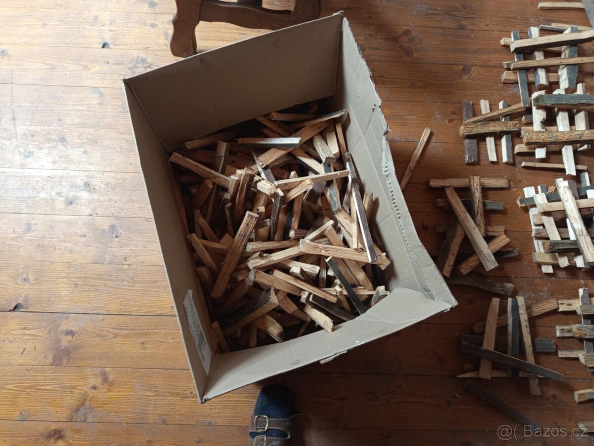 Prodám ručne sekane třísky na podpal ze stoletých podlah, chemicky neosetrene, jen extra suche drevo, co hori na jedno skrtnuti sirky. Mám nasekáno 5 kubíku, pri vetsim odberu sleva. Muzu poslat i balikovnou.