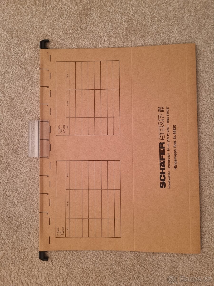 Papírové závěsné desky ve vynikajícím stavu (jako nové) včetně plastového okénka na popisky. Mám pouze 15 kusů, cena je za kus. Osobní předání buď kousek metra Rajská zahrada nebo kousek od metra Můstek.