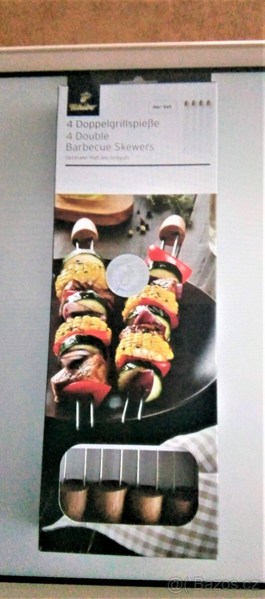 Dvojité grilovací jehly na špízy z nerezové oceli s dřevěnými úchyty,délka špízu je 29,5 cm