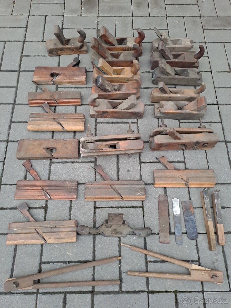 Starožitný dřevěný hoblík. Nalezovy stav na pude. Rad prodam jako celek. Mohu poslat.