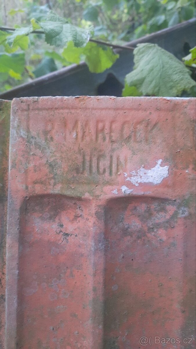 Střešní tašky B. Mareček z Jičína. Budou tak přes 100 let staré. Po demolici domu.