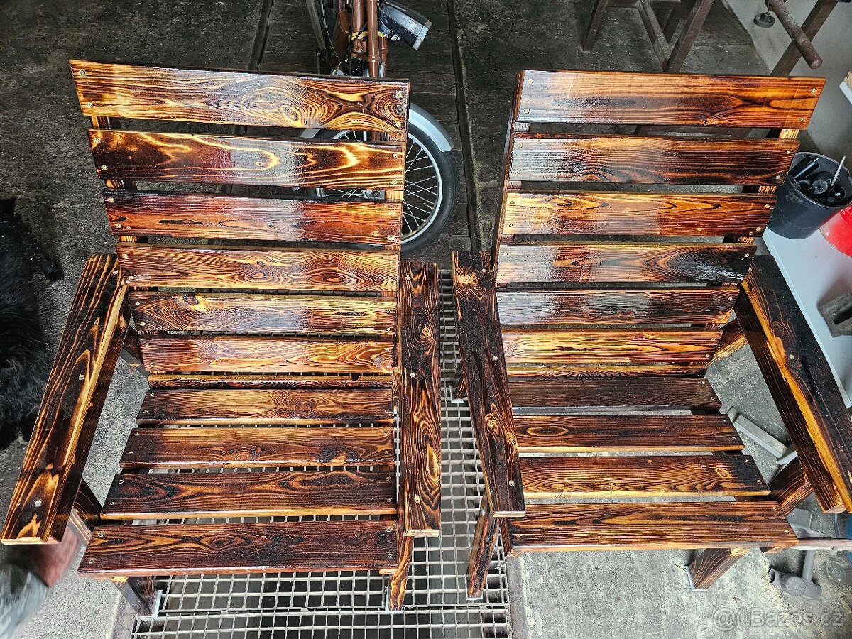 Prodám nové, kvalitní, ručně vyrobené zahradní křeslo z vyschlého opáleného dřeva. Natřeno fermeží a bezbarvým venkovním lakem. Spojeno vruty i lepidlem, velmi pevná konstrukce, vydrží velmi dlouho. Rozměry 75x60, výška 100, kovové nožičky, kvalitní vruty. K dispozici 2 ks, cena je za kus. K opalovaným křeslům možno dokoupit i 2 lavičky ve stejném designu, v přípravě je i stůl, tedy kompletní sada.