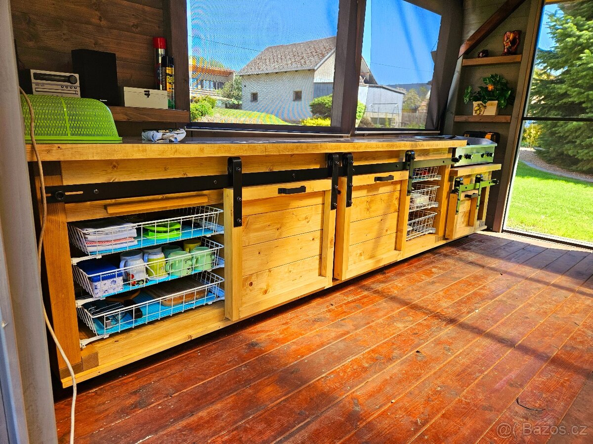 Masivní kuchyň 2,5m + 1m malá skříňka, hloubka skříňky 60cm, šíře desky 68cm, s trámů 55mm x 55mm a vlysy 120mm x 60mm v hodná do chalup, pergol a přístřešku ...Boky, dna,police i záda opalubkovany palubky 19mm. Šuplíky též na přání,které jsou vyrobeny z palubek. Celá kuchyň je ze dřeva. Deska o tloušťce 55/nebo 45mm. Výroba a rozmer dle přání zákazníka. Kuchyně jsou bez nátěru, vyrábíme vždy od října do unora. Za příplatek + montáž + doprava.