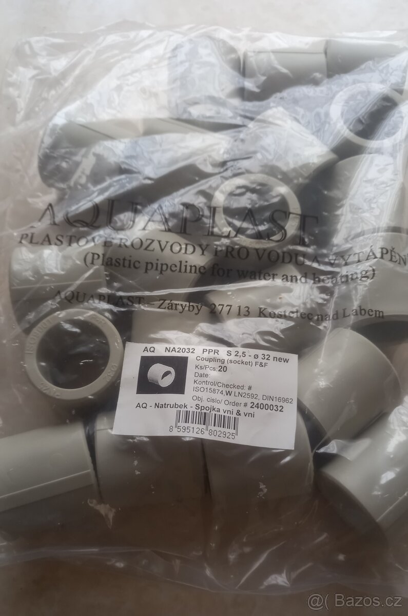 Všechny nátrubky jsou nové! (nepoužité). Nátrubky jsou plně kompatibilní se všemi PPR tvarovkami Českých i zahraničních výrobců. Nemusíte se tedy obávat, že Vám nátrubek nebude pasovat na Vámi již zakoupené jiné tvarovky. Česká výroba! Hygienická nezávadnost ve styku s pitnou vodou. Snadná, rychlá a čistá montáž. Spojování polyfúzním svařováním. Nátrubky prodávám jen na celá balení po 20-ti kusech. Cena za 20 kusů nátrubků je 98,-Kč (4,90/ks), Poštovné: na dobírku 140,-Kč, bankovním převodem 100,-Kč. Za jakékoliv množství zboží z mé nabídky inzerátů účtuji jen jedno poštovné. Pokud by jste měli zájem i o jiné PPR tvarovky, nebo větší průměry, které jste v inzerátech nenašli, tak Vám mohu na požádání zaslat mailem kompletní PPR sortiment s cenami. (Vše za skvělé ceny)