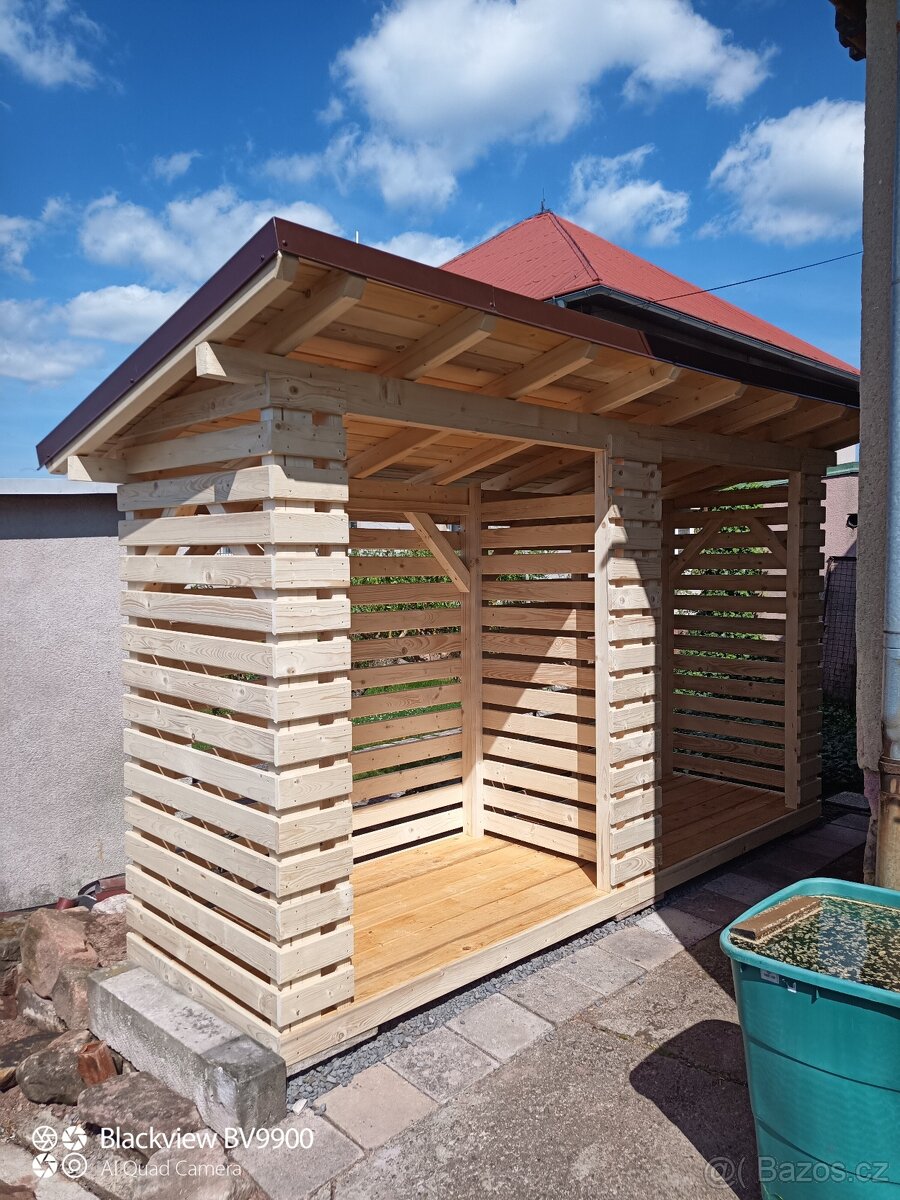 Drevnik - [12.2. 2026]Drevnik c 13 rozměry: 5,5m x 2m. ( Kůlna 3,5m x 2m a drevnik 2m x 2m). S tramu 80mm x 80mm ( na přání : s trámů 100mm x 100mm) a krovy 120 x 60mm. Za příplatek: montáž + 12 000kc a Šindel s oplechováním + 17 000kc + doprava 25kc za km. ...