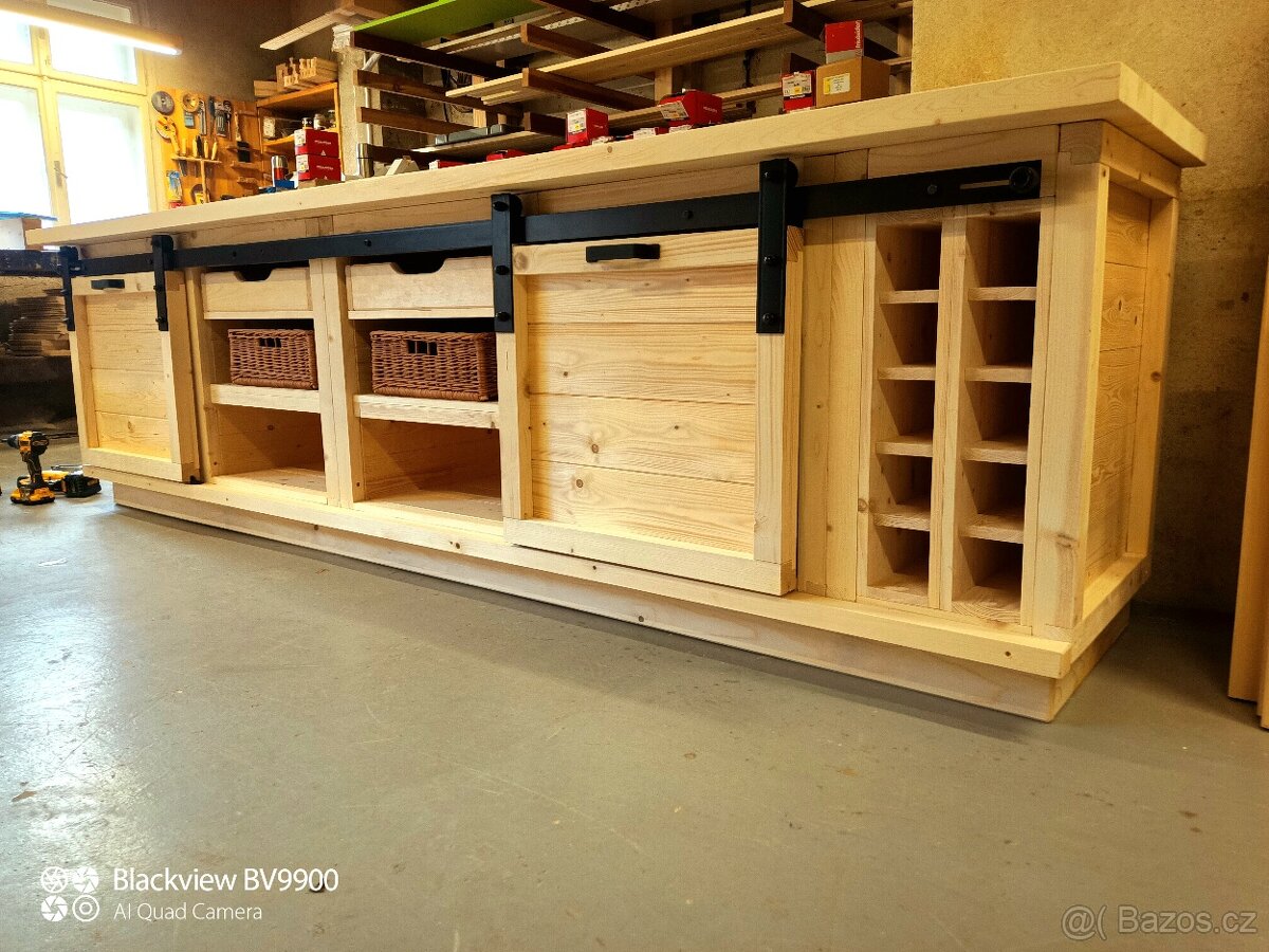 Kuchyň z masivu - [12.2. 2026]Masivní kuchyň 2,5m + 1m malá skříňka, hloubka skříňky 60cm, šíře desky 68cm, s trámů 55mm x 55mm a vlysy 120mm x 60mm v hodná do chalup, pergol a přístřešku ...Boky, dna,police i záda opalubkovany palubky 19mm. Šuplíky též na přání,které jsou vyrobe ...