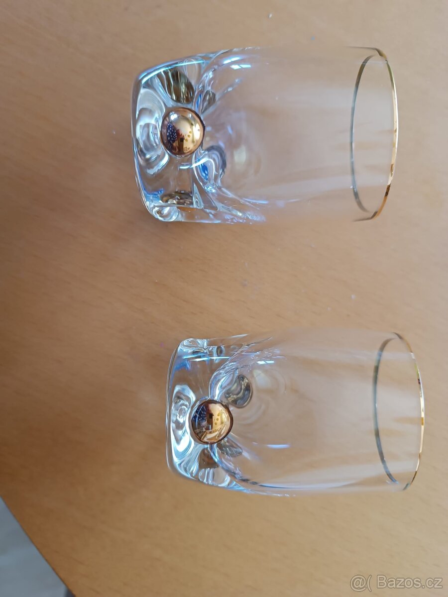 Prodám 3 ks skleniček, hladké, tenčí sklo, zdobené ze 4 stran vloženými zlatými kuličkami. Nepoškozené. Ta malá je bohužel jen jedna.