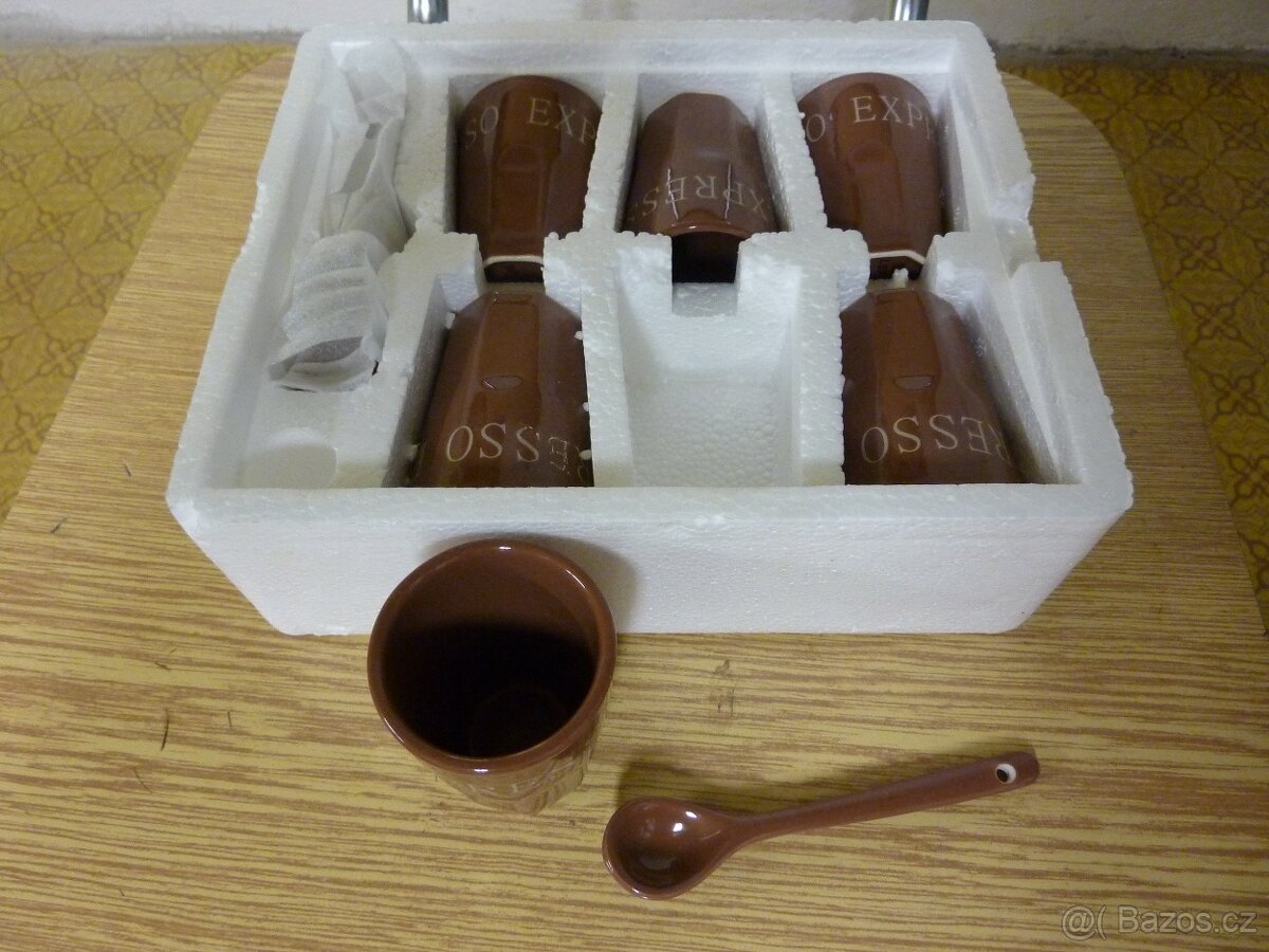 Prodám sadu skleniček (keramika)s nápisem expreso včetně lžiček výška 7cm