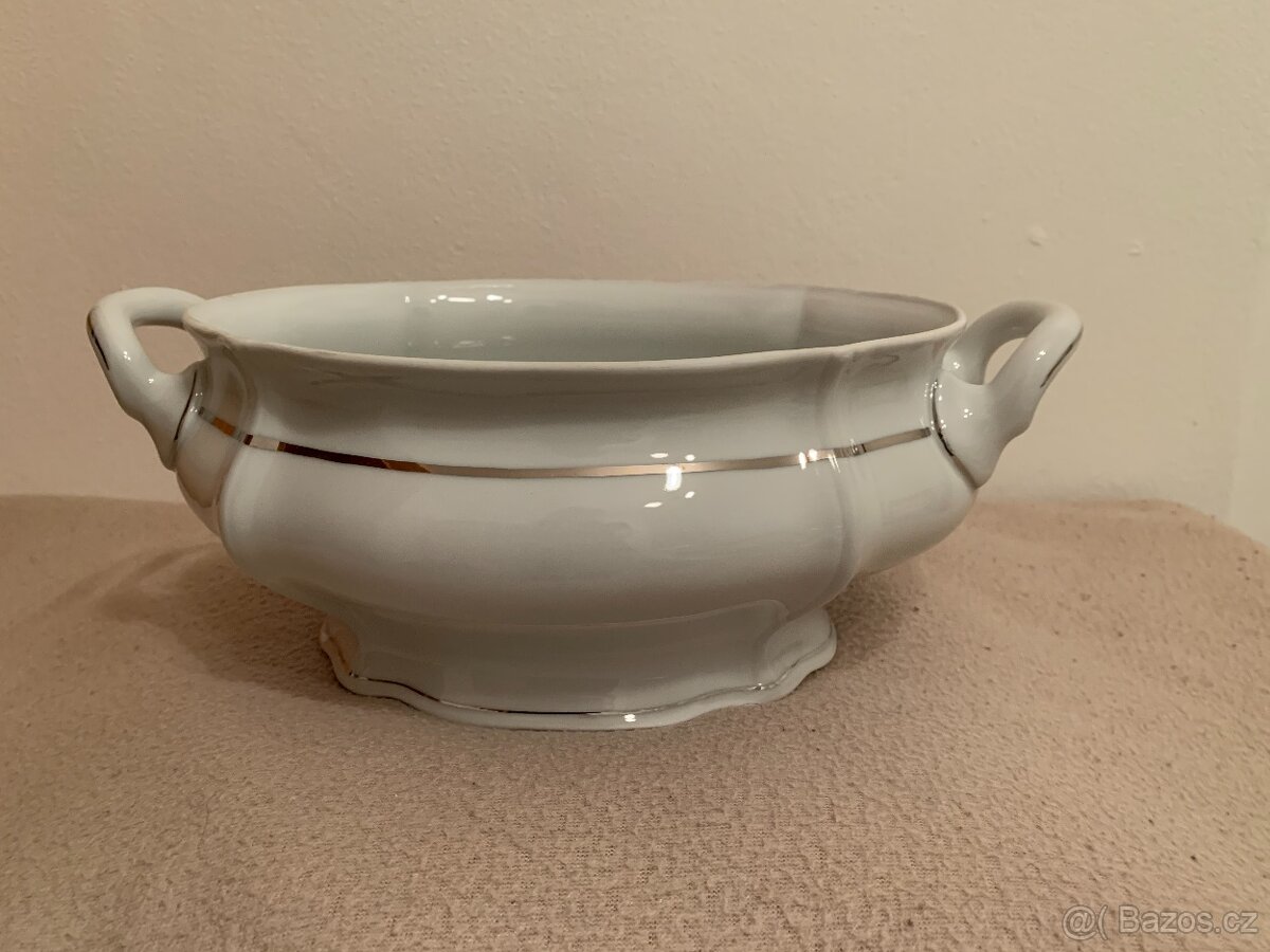 Servírovací mísa z porcelánky Richter, Fenkl & Hahn z Chodova na Sokolovsku. Rozměry: délka 24 cm/délka s uchy 30,5 cm, šířka v nejširším místě 17 cm. výška 11 cm.