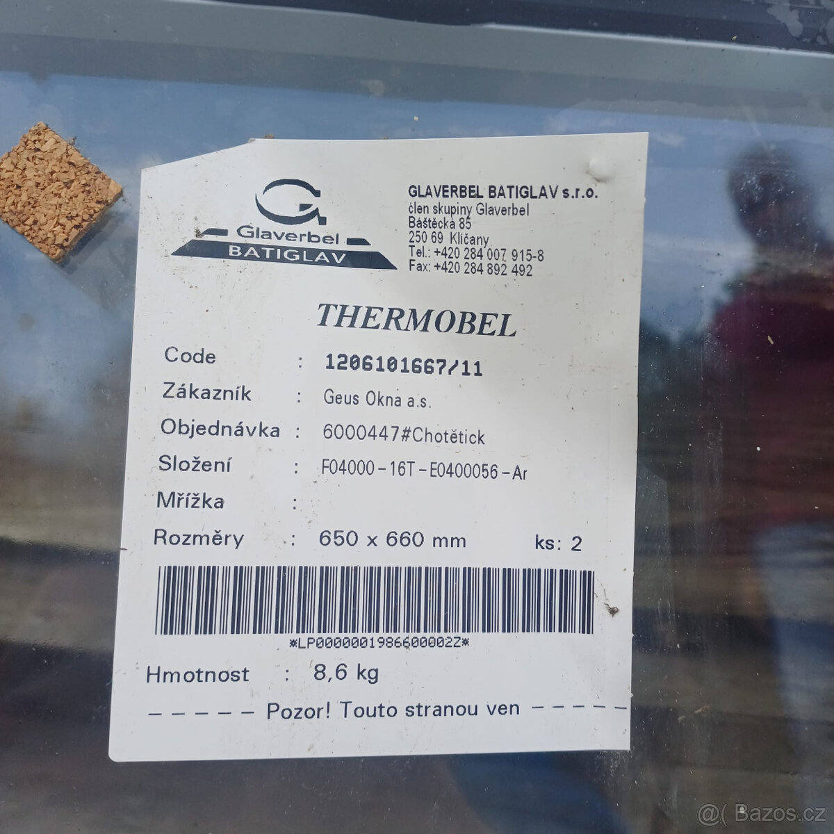 Prodám okenní dvojsklo od firmy Glaverbel značky Thermobel 650x660 mm, váha 8,6 kg.