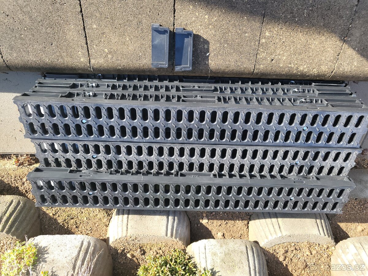 Prodám 13 ks plastových odvodňovací žlabů s plastovou mřížkou 1000x130x55 mm, + 2ks čílek. Prodej pouze jako celek, osobní odběr Brno.