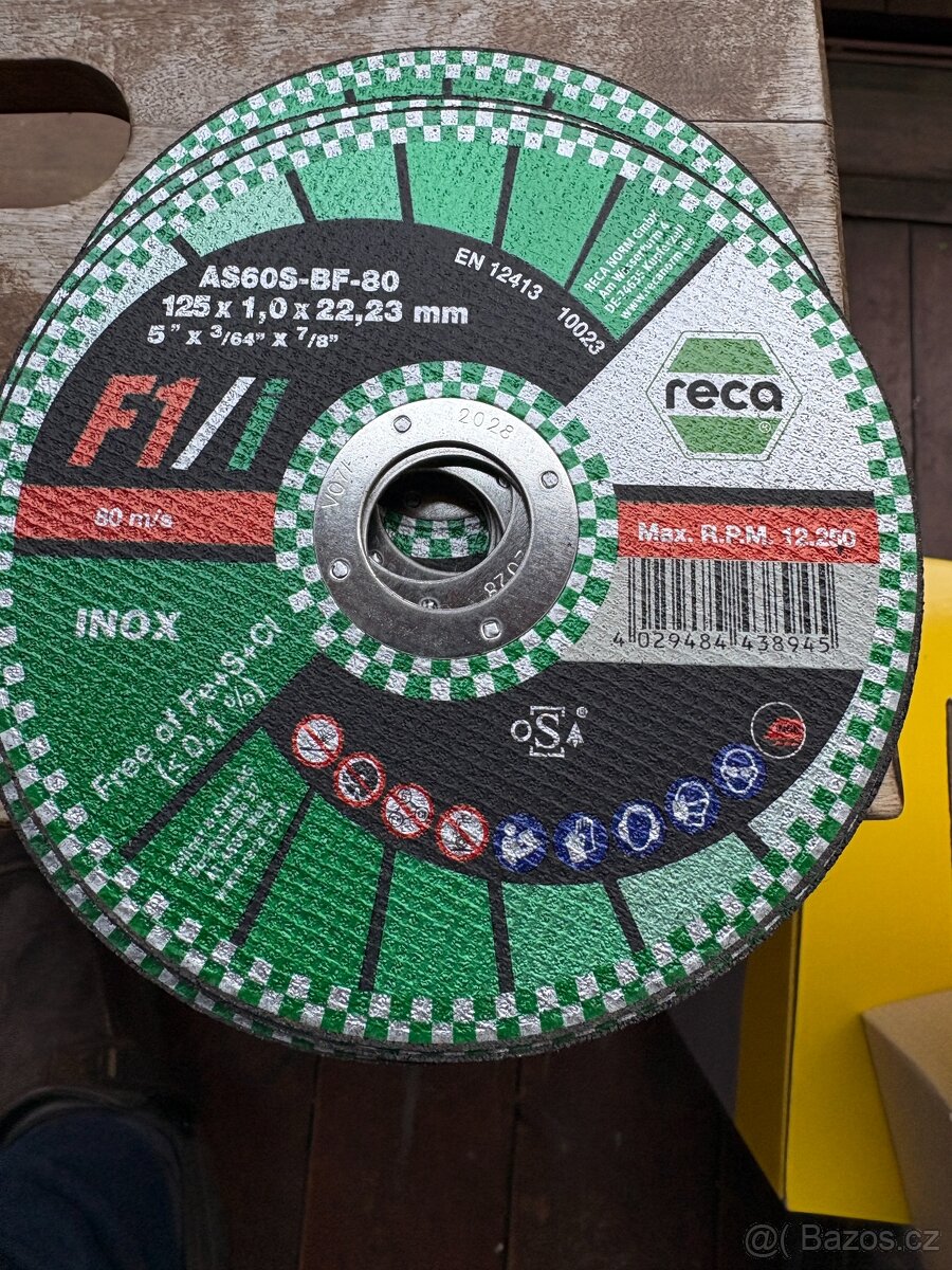 prodám nové řezné kotouče na nerez : - Reca 125x1 mm - 23 ks,kus za 22 Kč - NA OCEL(NE NEREZ) - Reca 125x2,5 mm - 25 ks - 20 Kč kus