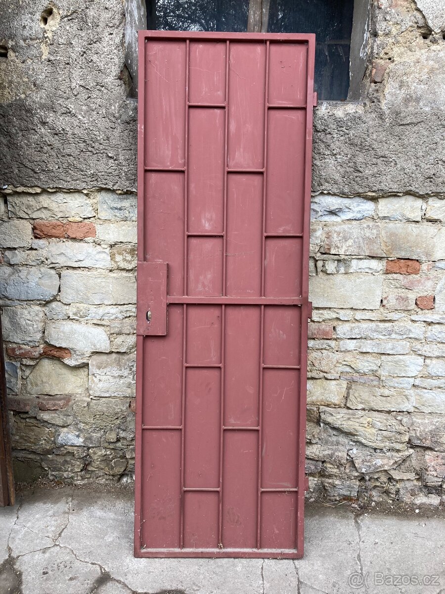 Prodám železné dveře, které původně sloužily jako náhrada laťových dveří sklepní kóje paneláku. Výška 200 cm, šířka 65,5 cm. Silný plech, hmotnost cca 30 kg. Osobní odběr Slaný.