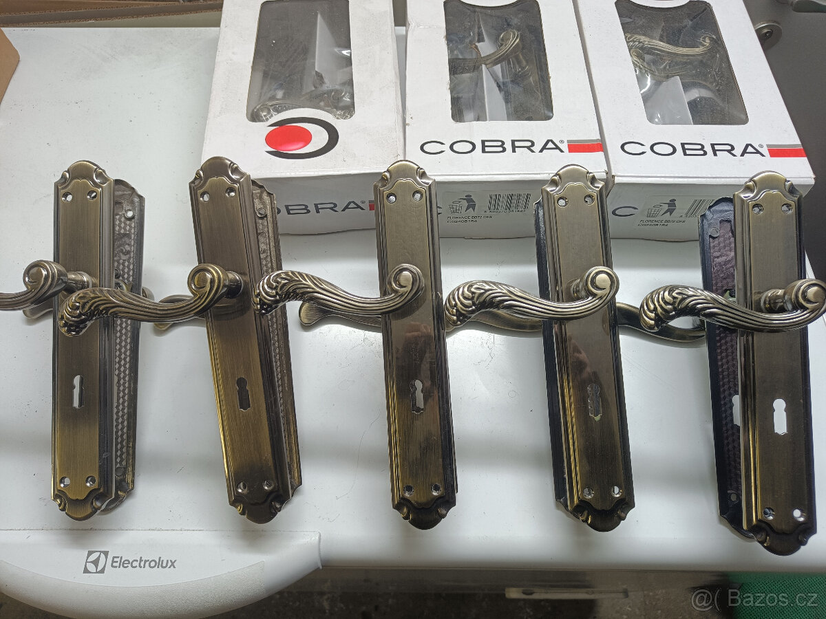 Prodám 8ks kování Cobra florance kartáčovaný a lakovaný bronz. Svého času stály cca 1300 Kč za ks. 3ks nové ostatní 5 ks použité, ale v perfektním stavu. Přešli jsme na modernu a někomu by se třeba na chalupu mohly hodit. Cena za vše. Platí do smazání.Prodej spíše v celku.