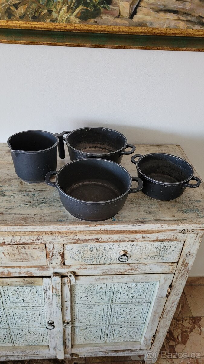 Sada hrnců německé značky ELO. Průměr 21cm (2 ks), 17cm (1js), 15cm (1ks). Bez poklicí. Použité.