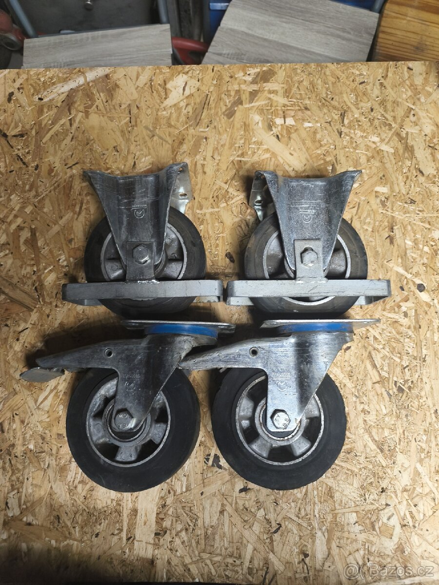 Průměr kolečka 16cm, nosnost 250kg/ks, dvouložisková, běhoun z tvrzené pryže,2 otočna s aretací, 2 stabilní, Torwegge Německo