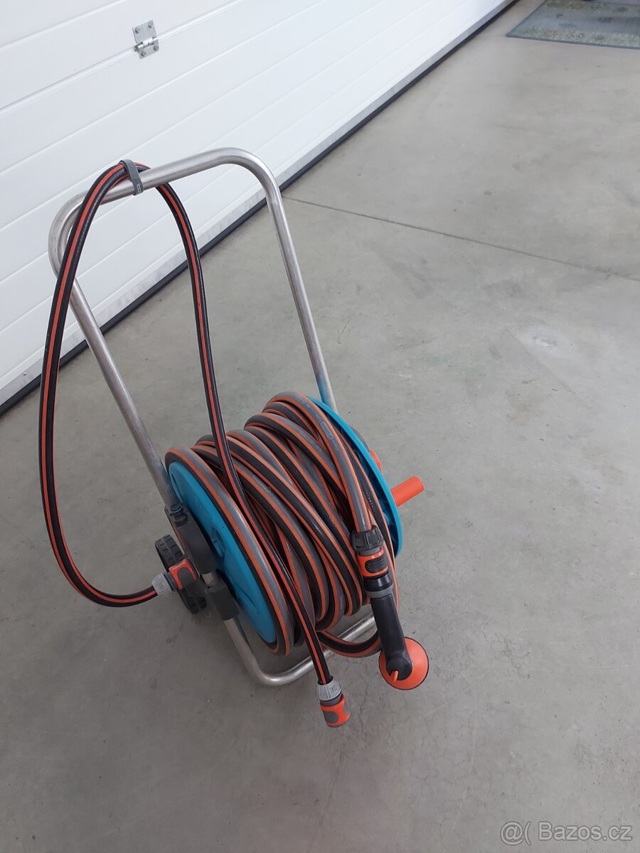 Prodám zahradní pojízdný vozík s hadicí 20m/13mm se zavlažovací pistoli 7 poloh.