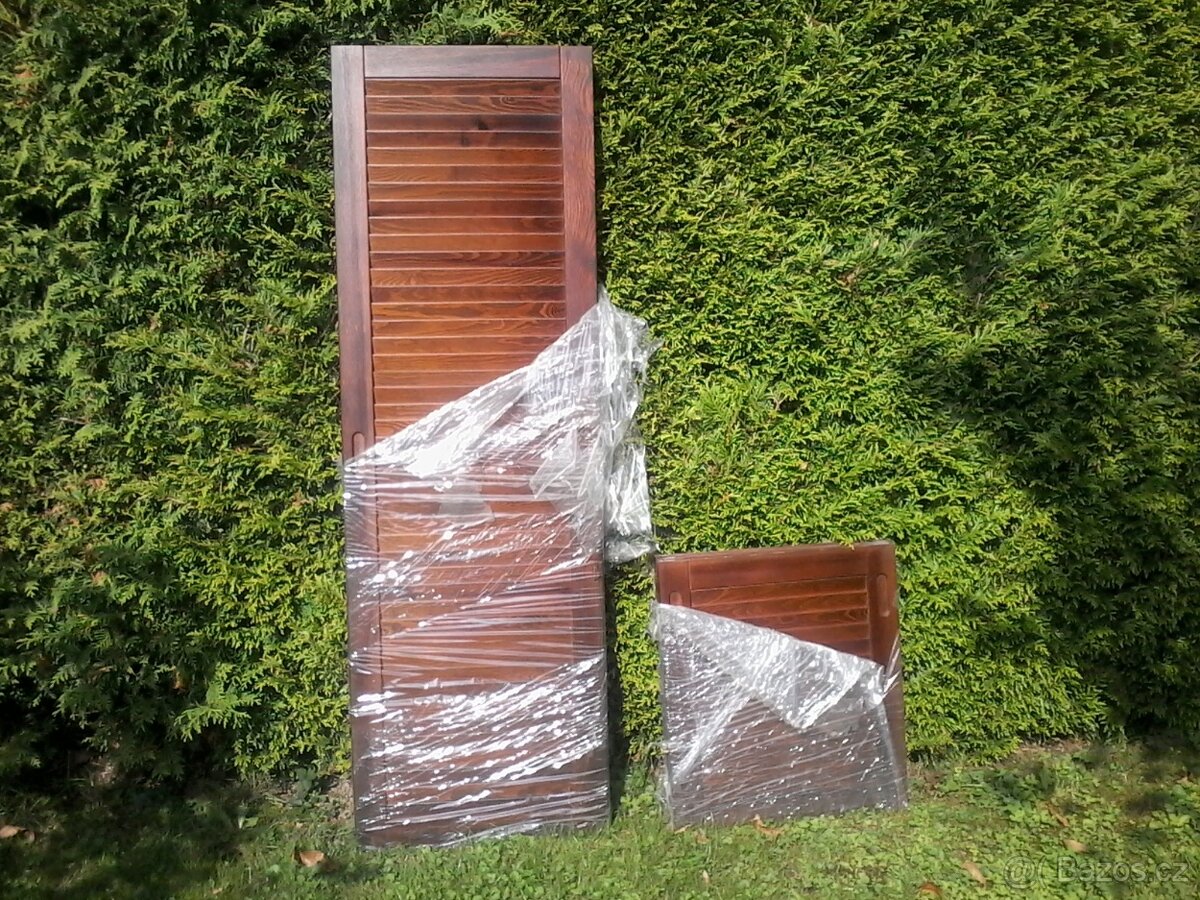 Prodám pěkné, nepoškozené, dřevěné žaluziové dveře ve dvou velikostech ze zrušené šatní skříně. Rozměry 155 x 49,5 x 2 cm, menší 55 x 49,5 x 2 cm. Barva hnědá jako na fotografii. Cena za 6 kusů větší a 6ks menší celkem 12 kusů je 3.500Kč. Prodej pouze v celku. Možno využít jako ozdobné okenice, paraván atp.