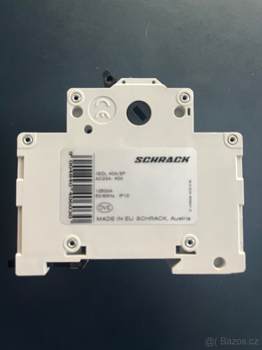 Prodám použitý, plně funkční 3pólový odpojovač/vypínač značky Schrack, typ E60L 40A/3P (AC23A, 40A, 50/60Hz, IP10).