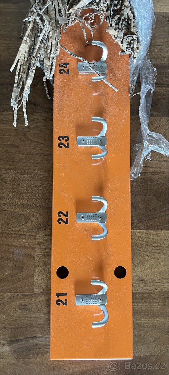Věšáková lišta oranžová plechová nová, vybalená pro vyfotografování. Věšáková průmyslová stěna, délka 150 cm, obsahuje celkem 10 dvojháčků, očíslované 21 až 30, toto číslování je v provedení nalepené folie, tzn., že je možné jej odstranit. Možné předání Praha nebo Vysočina.