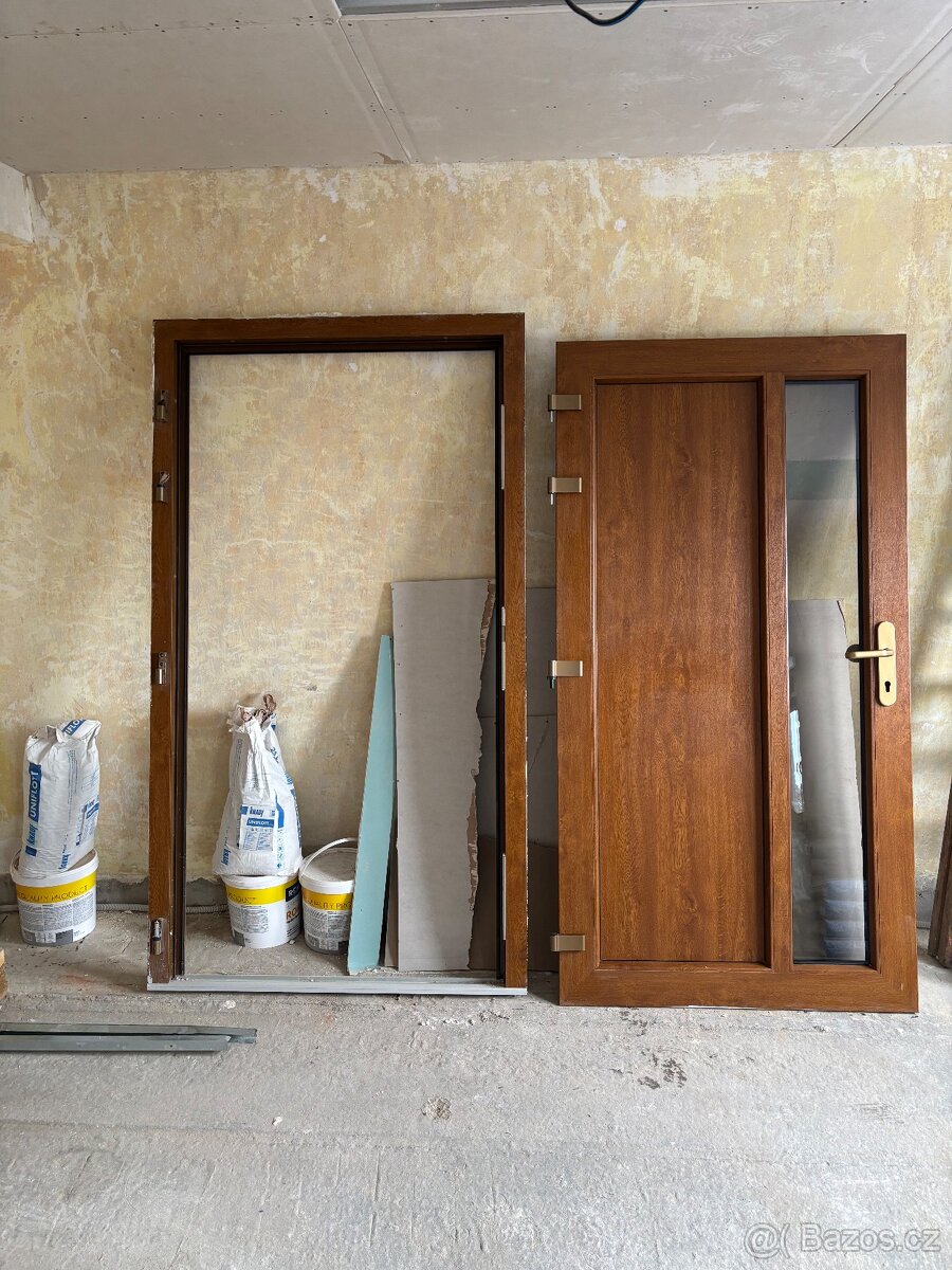 Prodám vstupní dveře plast, včetně zárubně, dekor zlatý dub oboustranný, včetně vrchního kování, rozměr zárubně šíře 1150 mm, výška 2050 mm, Levé, dva roky staré.