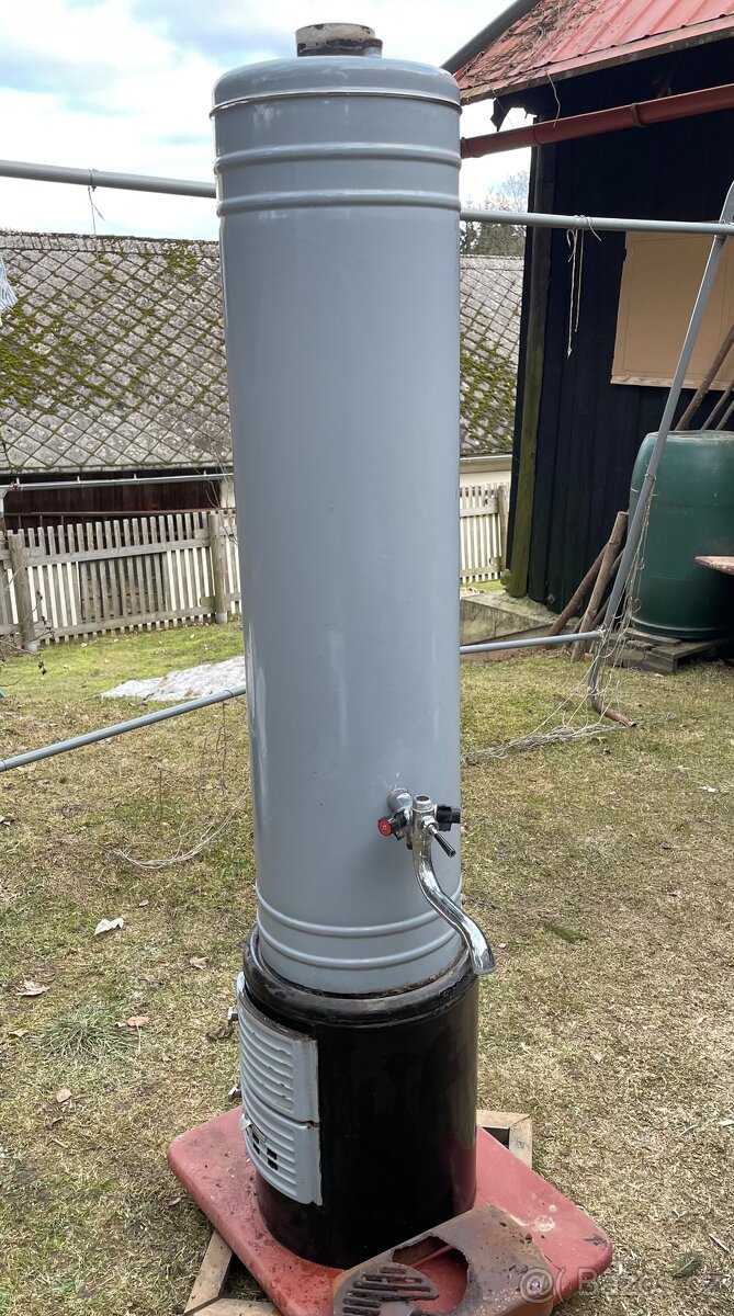 Prodám stará lázeňská kamna, šedomodrý smalt, šamot nepoškozen, chybí sprcha. Stav viz foto.