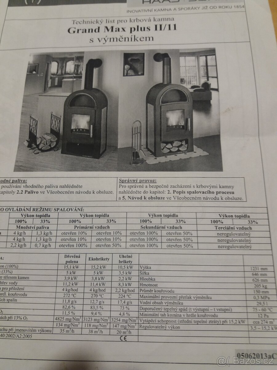 Prodám krbová kamna s výměníkem grand max plus II/11. Výkon 15 kW.