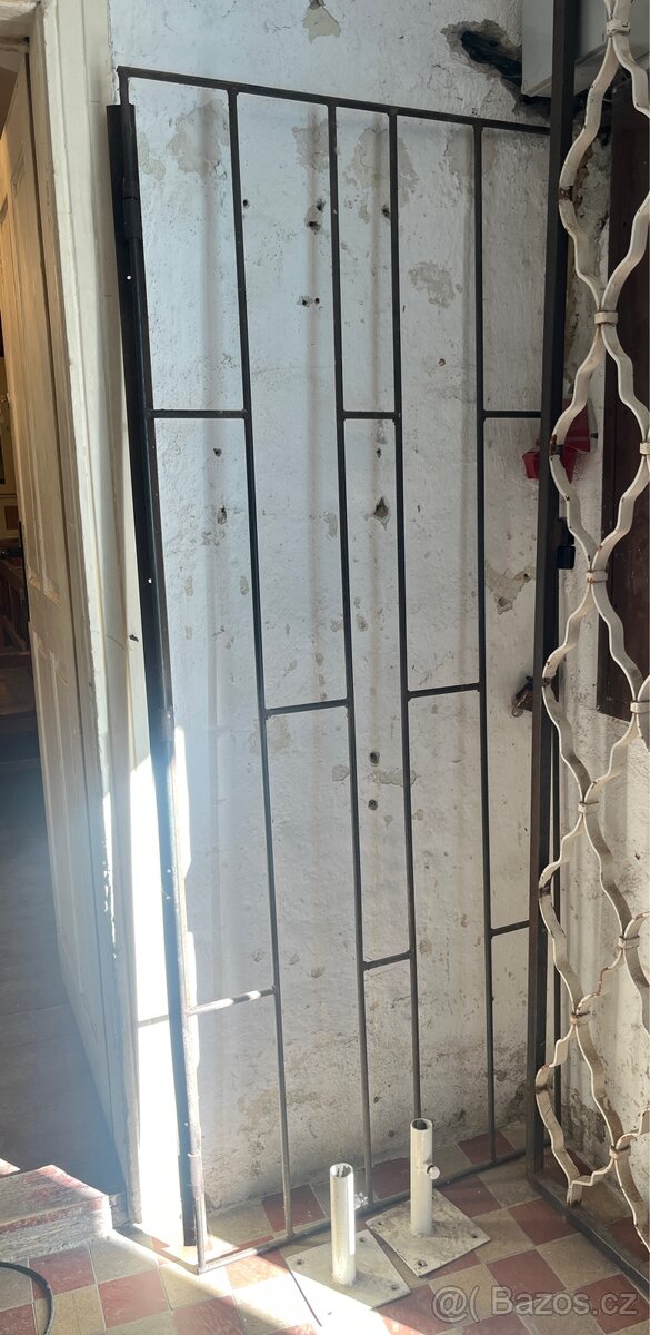 Mříž má panty – vhodná jako dveřní nebo okenní zabezpečení (sklep, chodba, vstup do domu apod.). Součástí jsou i spodní kovové patky pro ukotvení.