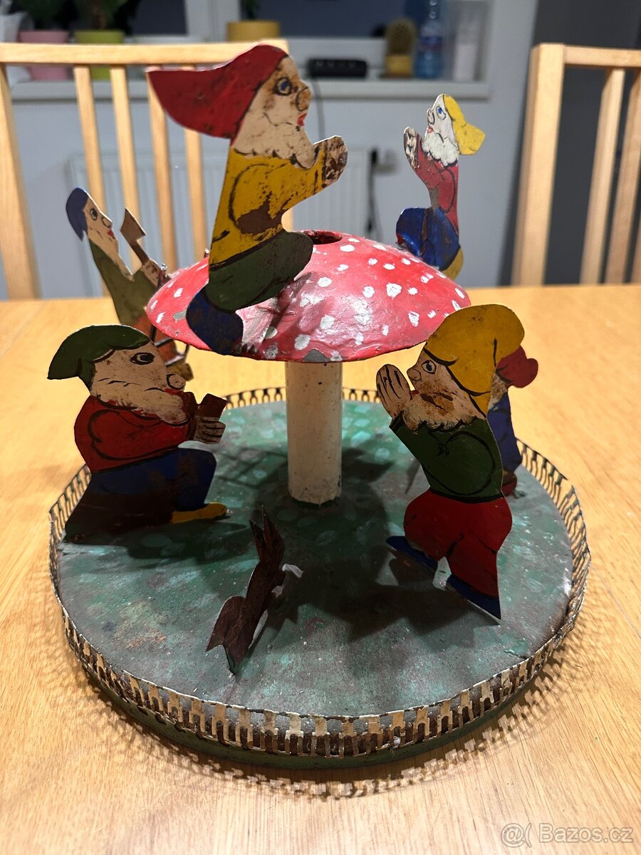 Krásný zachovalý plechový vintage stojan na vánoční stromek – trpaslíci/muchomůrka Cca 80 -90 let starý. Ručně malovaný