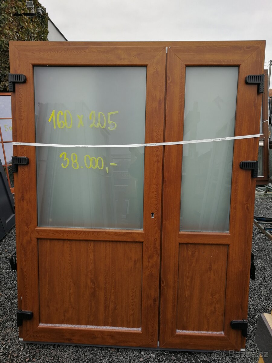 Dveře hnědé dvou křídlové plastové tyto nové co jsou na fotkách s cenou a rozměry měřeno venkovní rozměr rámu, dekor zlatý dub ven - bílé dovnitř, vchodové otevíravé VEN, mají mléčné dvojité izolační sklo, spodní část izolační PUR deska do které se dají instalovat dvířka pro domácí mazlíky, obě křídla se dají otevřít do kořán, jsou bez středového sloupku takže velký průchod, nízký alu práh, 3 D seřiditelné panty.