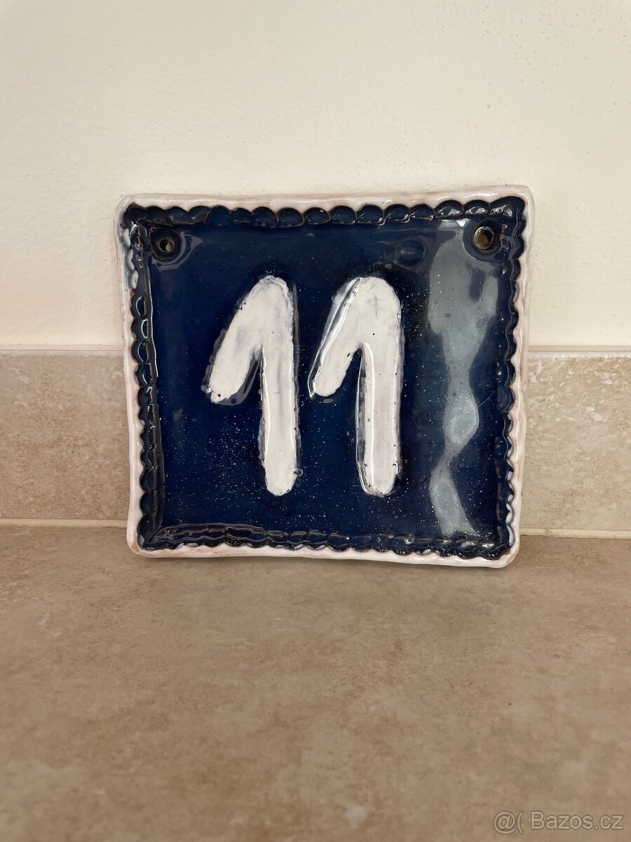 Keramické číslo na dům. Vyrobeno z keramiky. Pozadí je tmavě modré, číslice bílé. V horní části 2 otvory na připevnění. Rozměr 15x14 cm.
