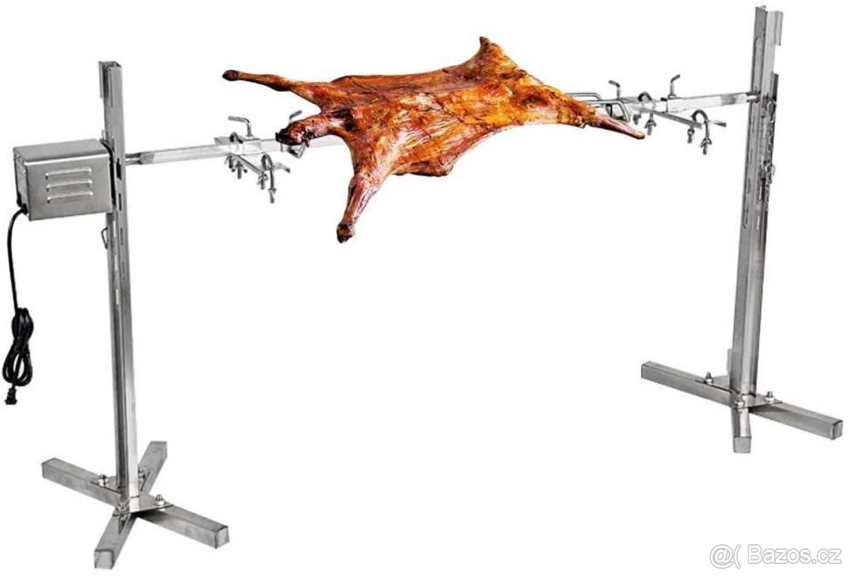 Rožňový gril BBQ z nerezové oceli. Vhodný na kuřata, stehna, krůtu, šunku. Grilovací jehla pro otáčení kuřat s motorem.