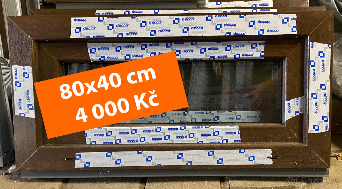 Plastové okno jednokřídlé venku ořech / uvnitř bílé. Dvojité izolační sklo, otevírací a výklopné (větračka), mikroventilace. Jsou nové nepoužité, š-80 x v-40 cm + 3 cm spodní parapetová lišta. K oknu klika