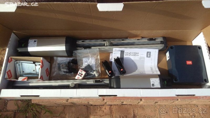 pohony pro dvoukřídlou bránu, nové, zabalené, záruka 2 roky, řídící jednotka Thalia, 2x motor pro křídlo šířky do 2,5m, 1x dálkový ovladač, fotobuňky, návod, instalační materiál, doporučené pro menší lehké brány, za příplatek +2000,- verze A40 pro větší brány, druhý ovladač +800,-, maják +800,-, cena včetně faktury a DPH 21%