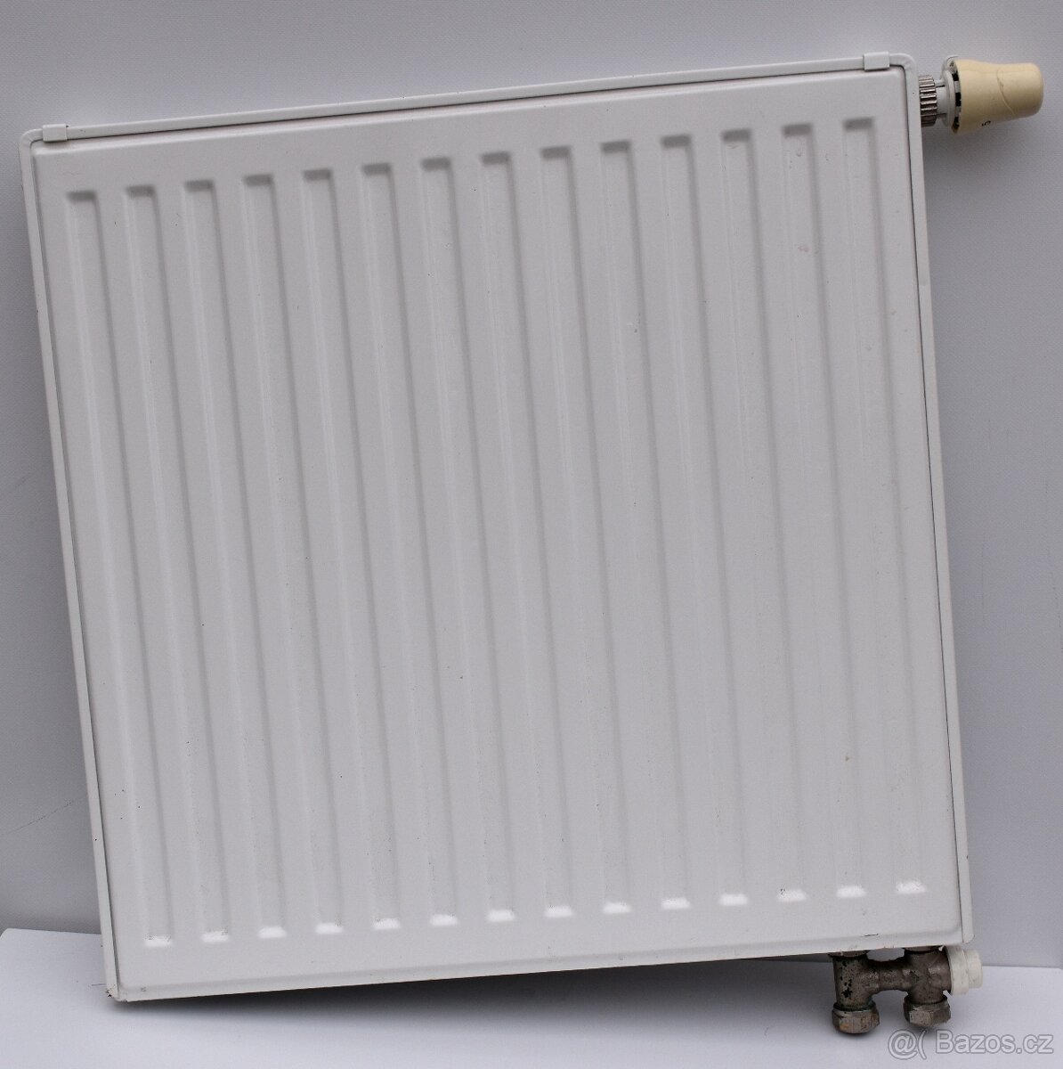 Prodám použitý radiátor 60 x 60 cm. Včetně termo hlavice a spodního připojovacího šroubení