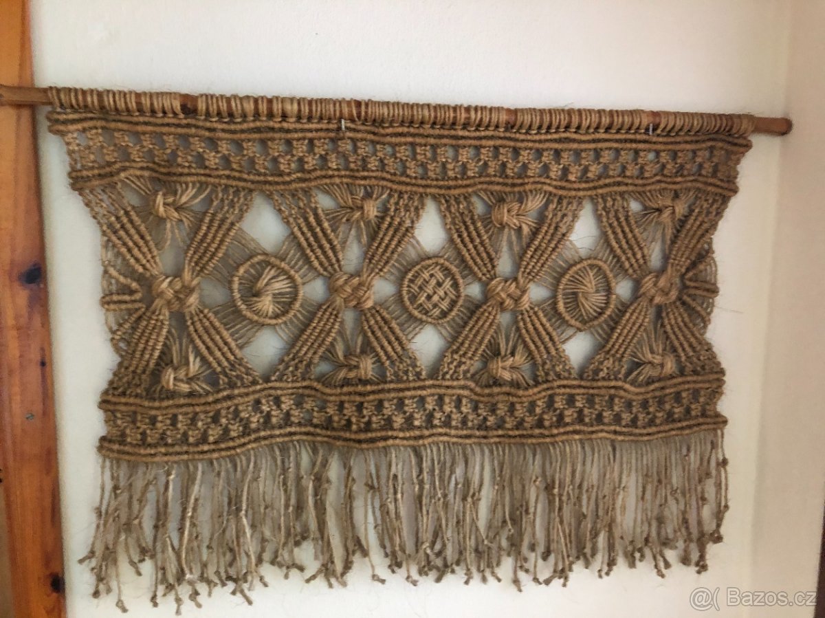 Dekorační závěs na zeď, barva přírodní, materiál sisalové vlákno, originál závěsná tyč bambus. Šířka vlastního závěsu 98 cm, šířka závěsné tyče 110 cm. Výška závěsu bez třásní 47 cm, celková výška 70 cm.